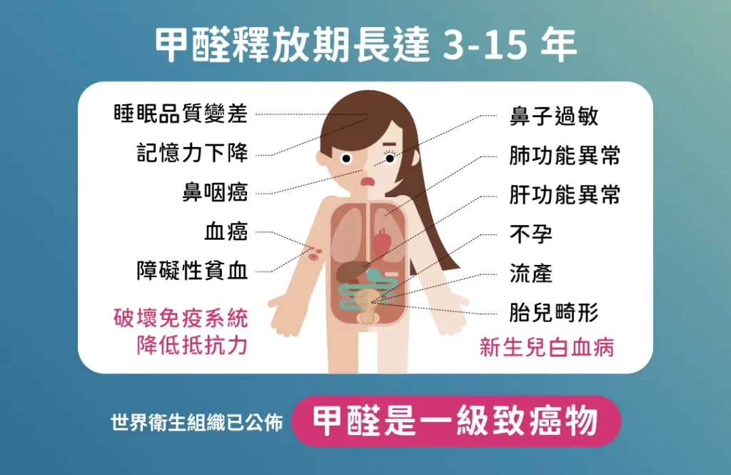特別是女性、兒童和易過敏的族群,若長時間生活在甲醛超標的空間中,輕則增加過敏、皮膚發炎的頻率,重則恐導致女性不孕、兒童白血病、癌症等症狀。