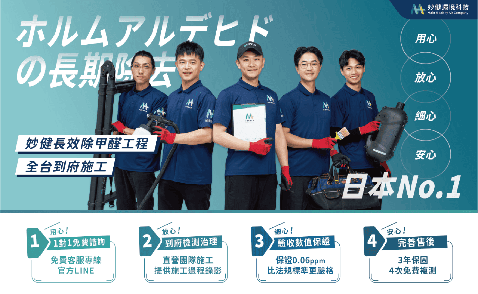 妙健環境科技是一家規模化、制度化的除甲醛公司,提供全台一致標準的甲醛治理服務。我們的團隊包含具證照的正職技師與空品顧問,所有流程—從初步評估、專業檢測、施工治理到完工驗收—皆由專業人員執行,確保服務品質可控、成效具追蹤性。 在妙健,我們不只「除甲醛」,而是從工程規劃、施工工法到客戶體驗,全面落實高品質空氣治理。