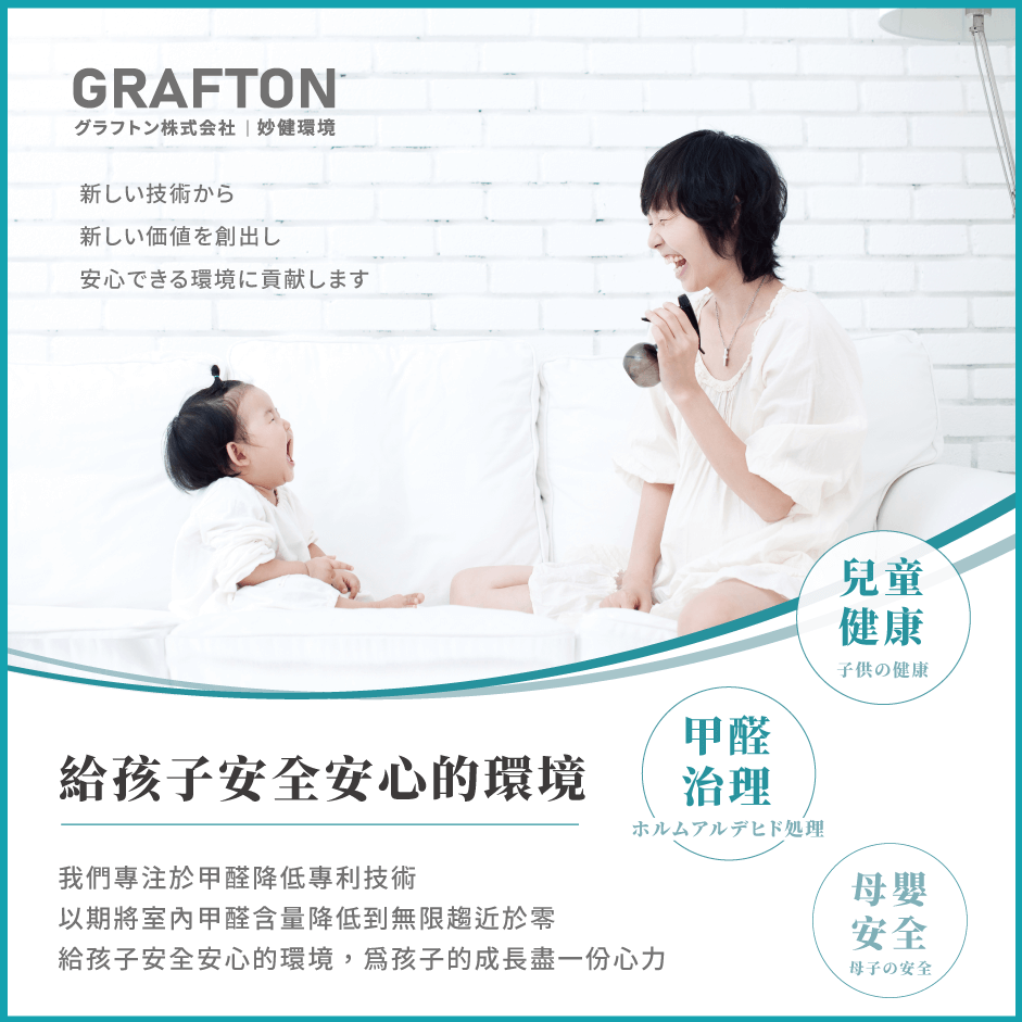 日本GRAFTON株式會社長期致力於保護兒童免受甲醛污染的危害,尤其是降低因甲醛引起的白血病風險。我們專注於甲醛分解的專利技術,十餘年來致力於將室內空氣中的甲醛含量降至接近於零,以提供更安全的成長環境。