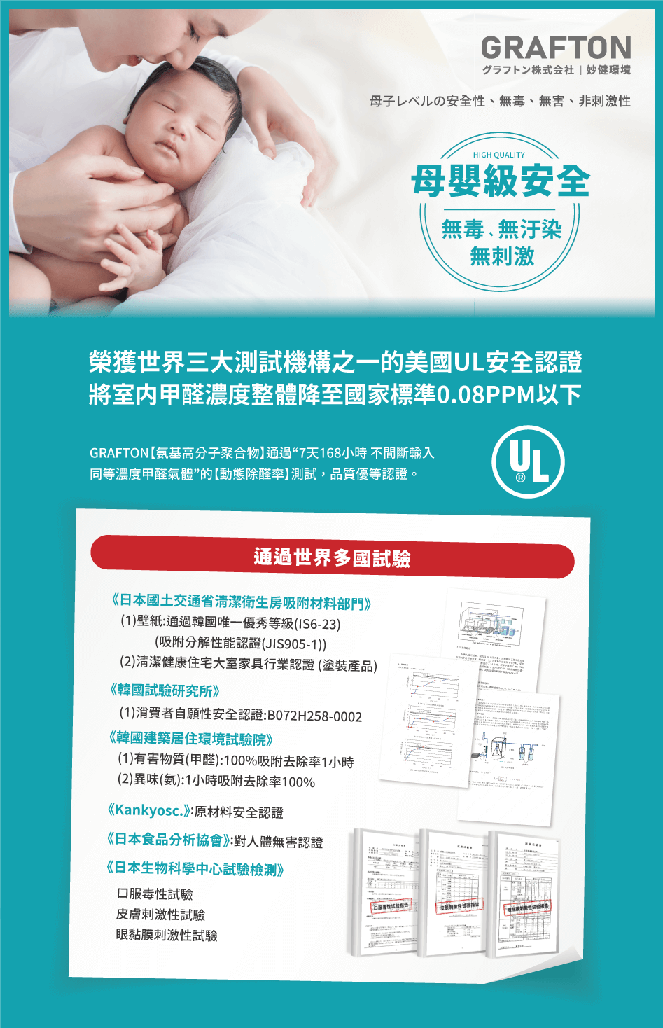 GRAFTON的除甲醛技術經和多國試驗機構驗證,並榮獲世界三大測試機構之一的美國UL安全認證,適合兒童、寵物和孕婦等敏感族群的家庭。