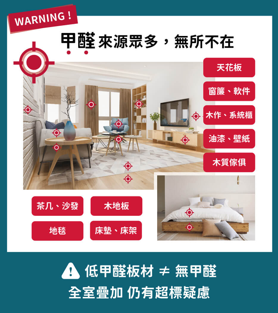 當這些物品中的甲醛隨時間逐漸釋放並在室內空間中累積疊加,就會增加室內的甲醛濃度並導致超標的風險,會影響居住環境的空氣品質與人體健康。