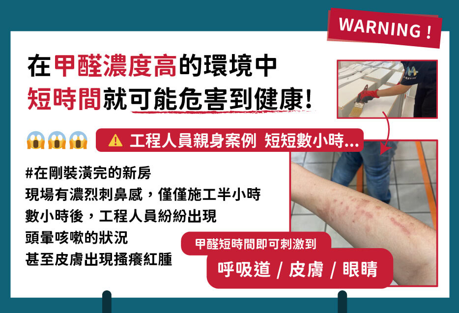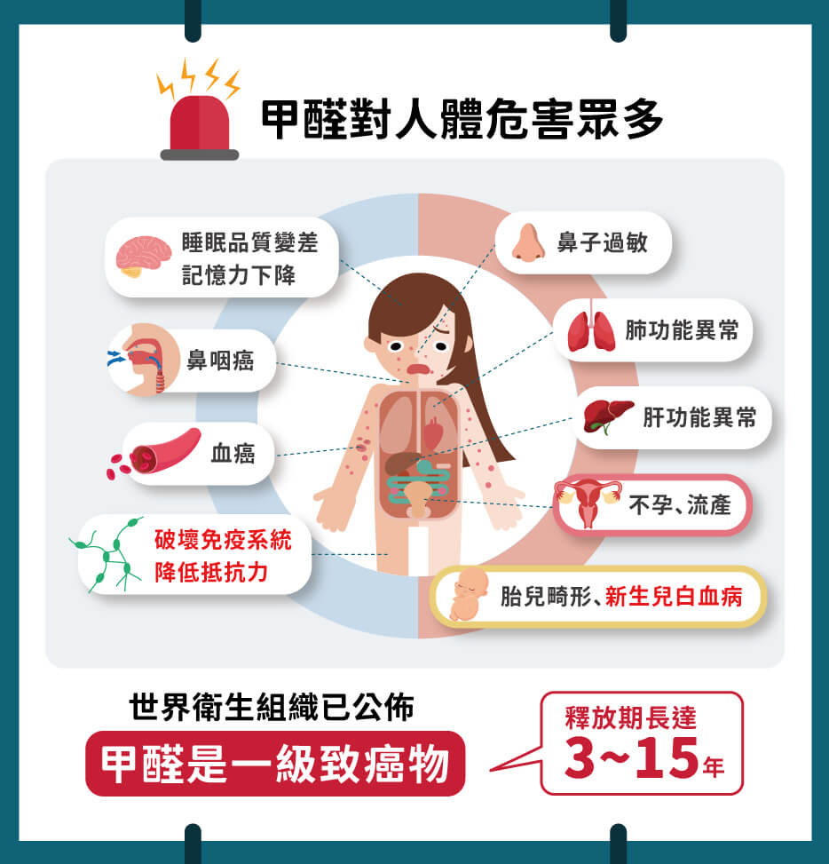 世界衛生組織已將甲醛列為一級致癌物, 甲醛的釋放期可長達 3 至 15 年, 長期接觸容易引發一系列慢性健康問題, 包括睡眠品質下降、過敏、記憶力減退、肺功能異常,甚至更嚴重的疾病如鼻咽癌、肝功能異常、白血病、不孕症、再生障礙性貧血、流產、免疫系統受損、新生兒白血病等。