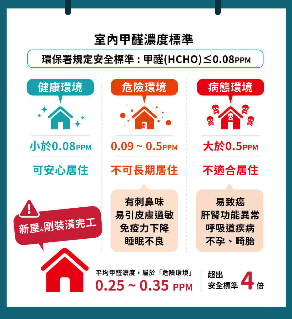全室密閉一小時,甲醛累積平均濃度標準 ≤ 0.08ppm,才符合安全標準。