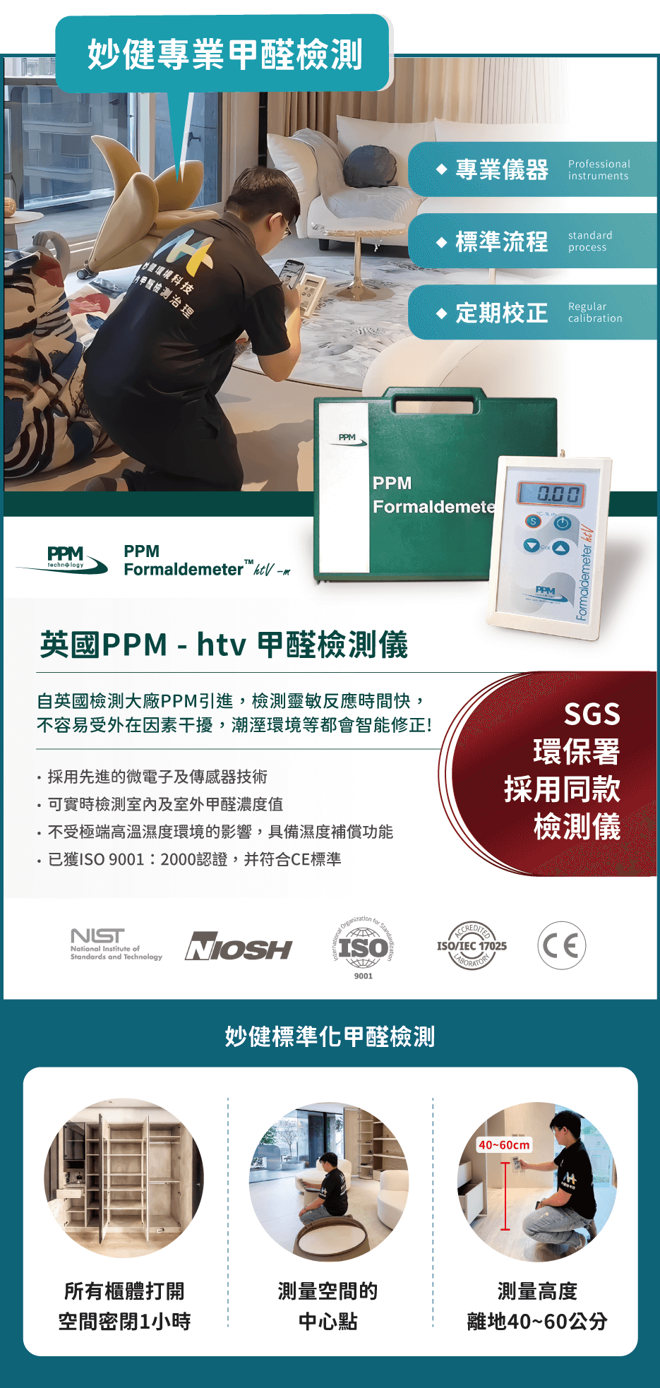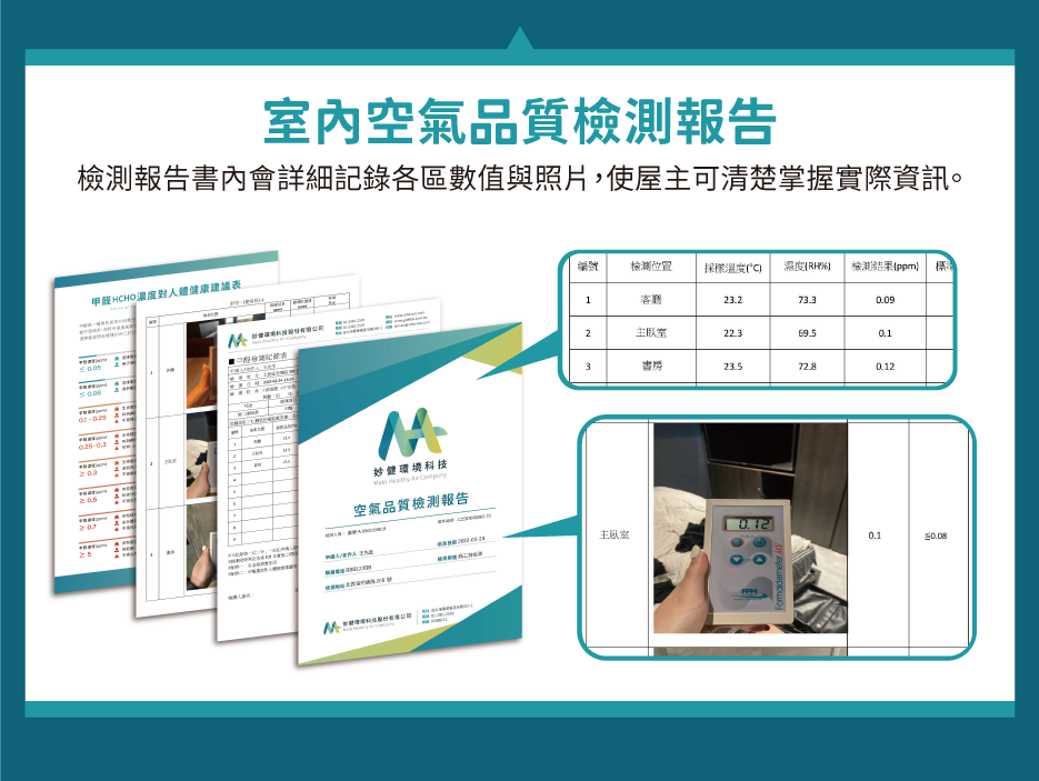 妙健培訓的專業工程人員,使用與 SGS、行政院環保署同款甲醛檢測儀 —「英國 PPM – htv 甲醛檢測儀」,並遵循與法規相同的標準化的檢測方式,距離門、窗、牆50公分以上之空間中心點 & 高度 40~60 公分處採樣檢測,以密閉一小時累積平均濃度為標準數值。