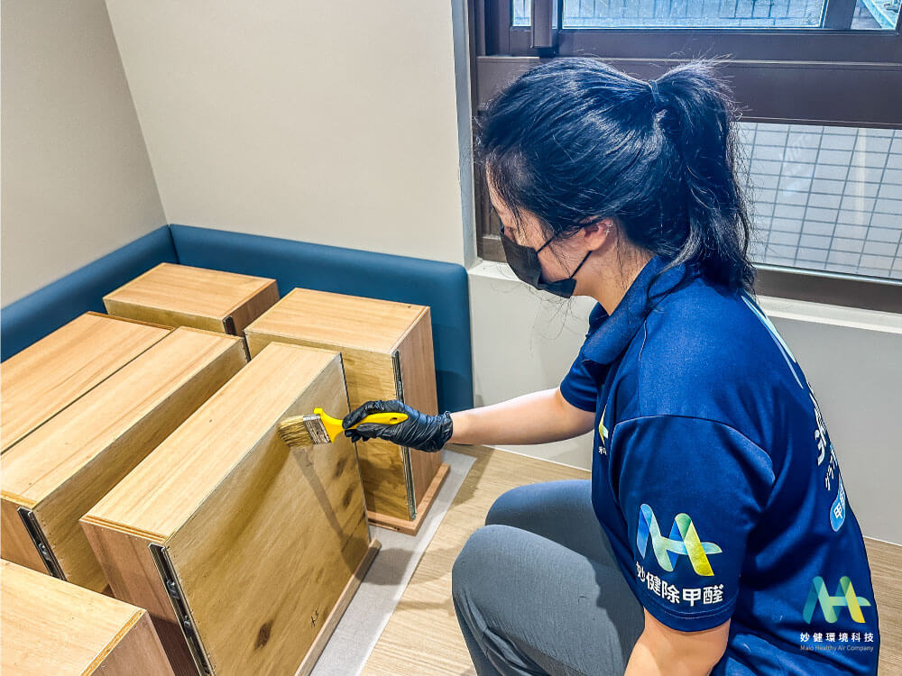 妙健團隊針對本次德安臻藏案進行了完整的現場評估,從天花板、牆面、木作、家具、窗簾到床墊,每一個可能釋放甲醛的來源皆不放過,確保甲醛有效分解,不再反覆揮發。