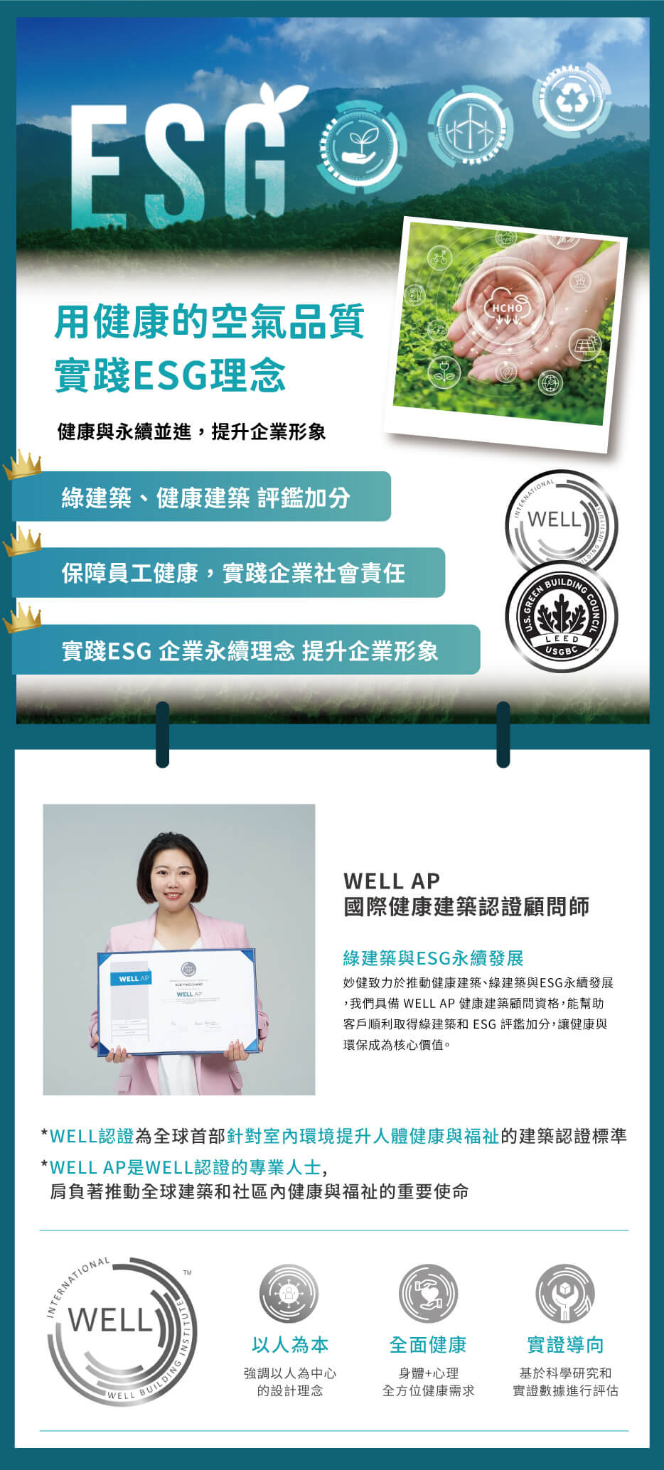 在 ESG的發展趨勢中,室內空氣品質管理也是企業永續發展的關鍵之一。妙健擁有 WELL AP認證 顧問師證照,可以幫助企業在健康建築與綠建築等評鑑中加分,並達成對員工與社會的承諾。清新、健康的空氣不僅能協助企業實踐ESG,並能提升員工的工作滿意度,有助於塑造良好的企業形象,為企業贏得內部員工與客戶的信任。